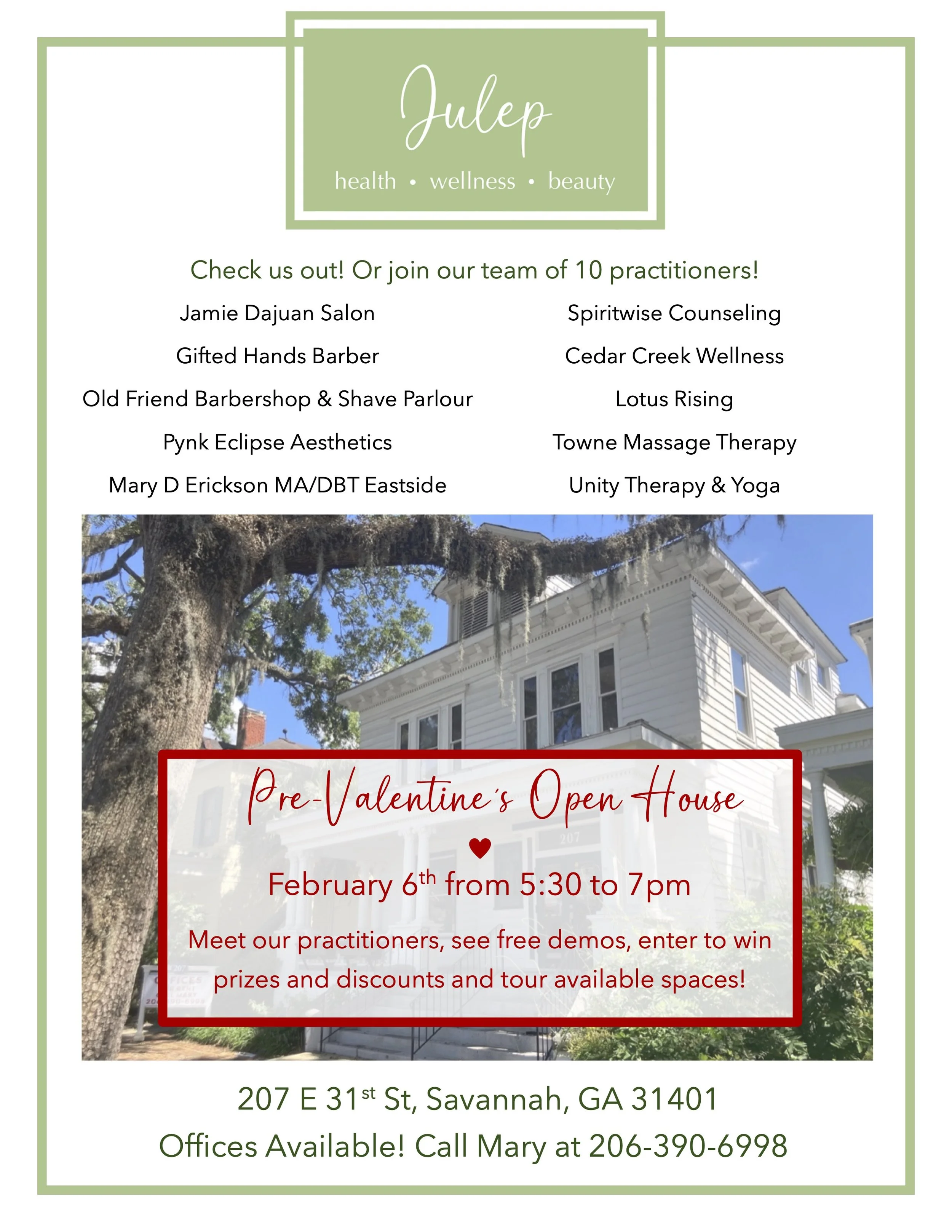 Julep is a wellness collective, comprised of individuals dedicated to helping others be well, be it mental health care, medical services or beauty treatments. We strive to create a welcoming space for clients and visitors of all identities and backgrounds.